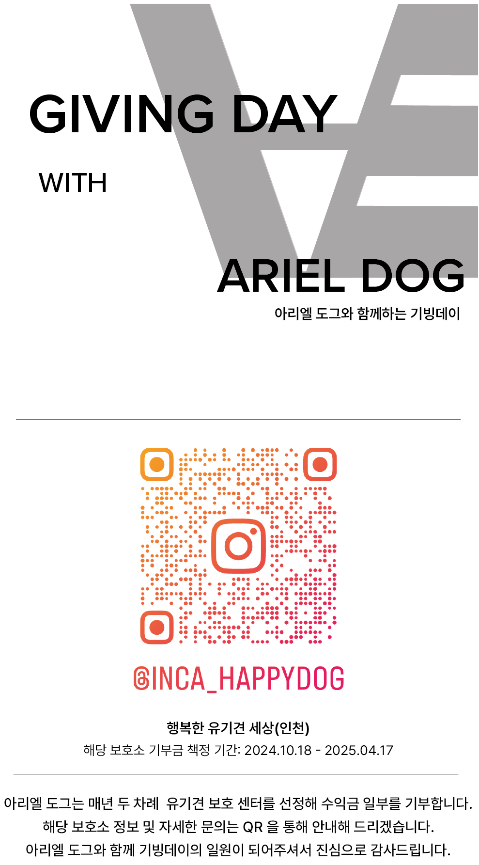 아리엘 도그와 함께하는 GIVING DAY 2024 페이지 정보 작성자 관리자 조회604회 작성일 24-09-06 23:16 본문 페이스북: https://www.facebook.com/INCA2009/?_rdr 인스타그램: https://www.instagram.com/inca_happydog?igsh=ZnA0ZmE0ZnZxNmQ0 네이버 블로그: https://m.blog.naver.com/inca_happydog?tab=1 다음 카페: https://m.cafe.daum.net/ccchappydog/_rec 목록 댓글목록 댓글목록 등록된 댓글이 없습니다.